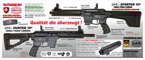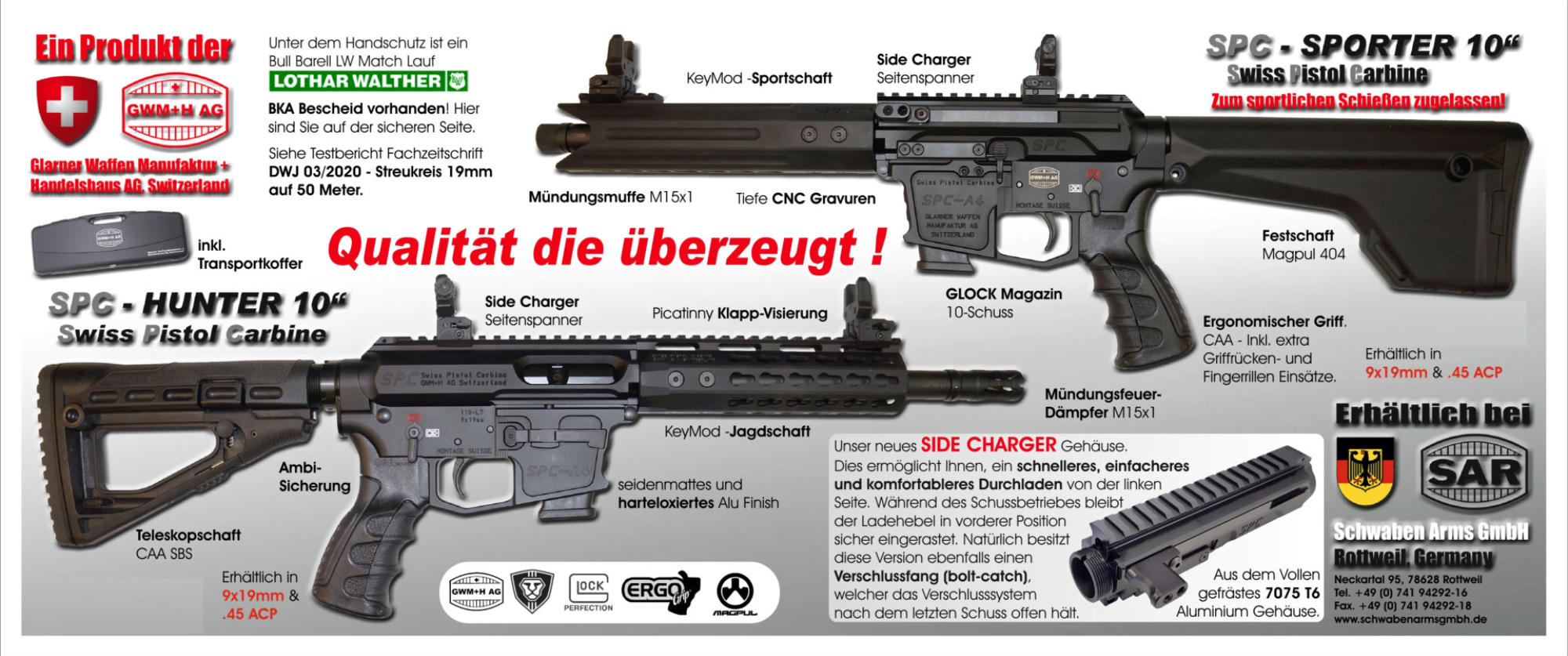 Ab jetzt Lieferbar.9x19mm / .40 S&W / 10mm AUTO / .45 ACPAlle SPC nutzen das orignal GLOCK Magazin.Einfaches Zerlegen ohne Werkzeug, mit den original AR15 PushPins.Der SPC wurde nach großer Kundennachfrage, über einen kompakten modularen halbautomatischen Karabiner, der die GLOCK Magazine der Pistole fast, konzipiert. Seine Eigenschaften und Leistungsdaten wurden speziell für den Sportschützen angepasst.Testbericht DWJ 03/2020